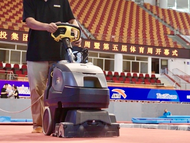 开赛前,卡赫清洁专家们对场馆内外进行了实地考察,并针对本次赛事制定了针对性的清洁解决方案。由于体操项目的特殊性,比赛场地往往会铺设大量地毯,而在比赛过程中,运动员需要在手上擦镁粉来增大摩擦系数。如果没有及时清理散落在地毯上的镁粉,不仅有碍场地的美观,还会影响选手的发挥以及比赛的安全性。作为全球最大的清洁设备和清洁解决方案提供商,德国卡赫携众多便捷灵活、性能高效强悍的专业清洁设备来到德州,为赛场内外的众多区域提供全场景专业清洁服务,竭尽全力守护跃动赛场。