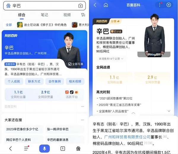 如辛巴这类话题争议人物纷纷进驻“我的百科”,反映了“我的百科”作为互联网人物专属名片的价值所在,在“我的百科”中,“辛巴”们焕发了新生。“我的百科”天然的权威性和社会公信力,是名人展示真实自我的重要渠道。对于公众群体而言,“我的百科”也是一个检索名人的常用入口,可以了解一个更为全面的“辛巴”,而不是仅仅是媒体的片面解读。